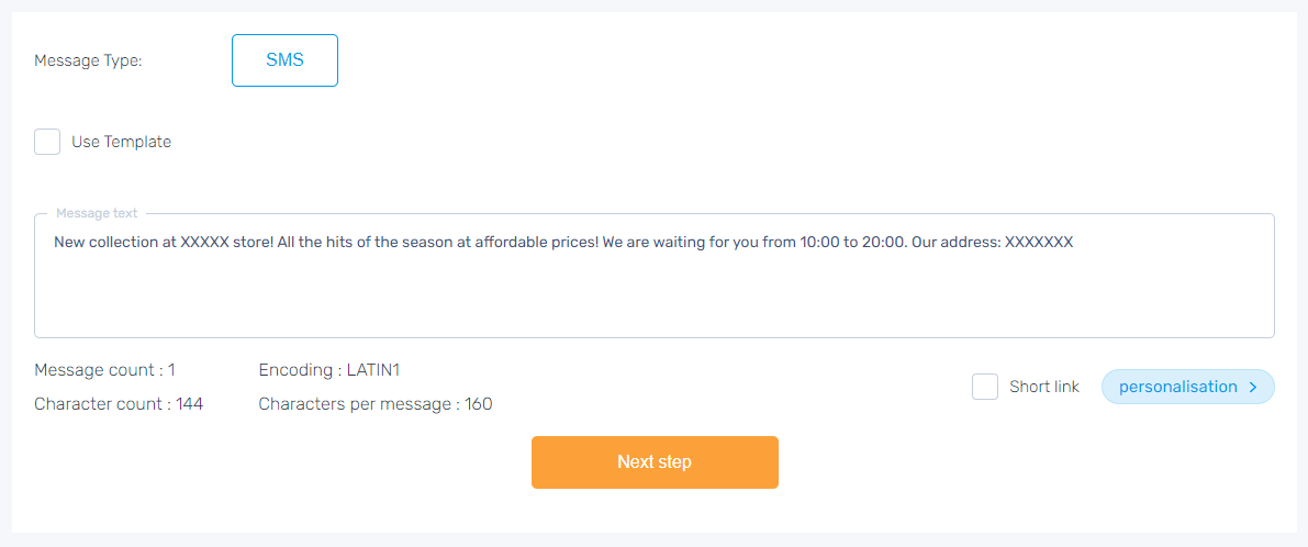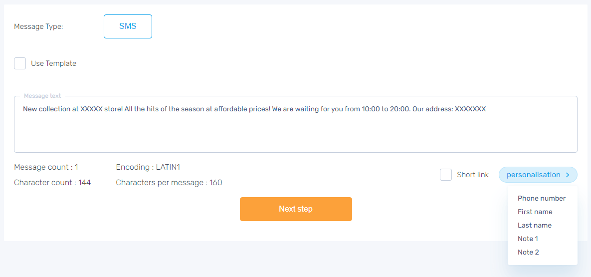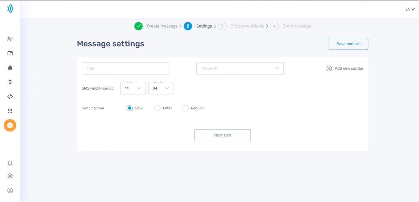 Let’s say you have to create a text message: notification store clients about arrival of new collection. Choose message type “SMS” (by default), sender (in that case you may specify as a sender a store name; how to create a sender, see p. 5), sending time – now, and leave SMS lifetime on default.