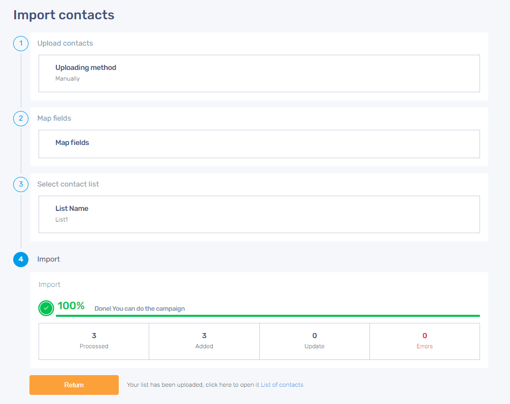 Pay attention! If the progress bar hangs while importing, do not try to add list again. Wait while the list is fully loaded. If it doesn’t happen, write to our support team to email support@textvol.com. Specify your login and the crux of the problem and attach your importing list: we often find errors or excessive data in lists.